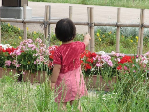 2014-07-09 女子は やっぱり 花が好き! 金沢の街 ある休日の夕暮れ時、近くの公園で、いつものように ボケ~っとしてると、家族連れが通り過ぎました。 お父さんはすいすい歩いていましたが、女の子は じーーーーっとお花を見ていました。 やっぱり女子は お花が好きなんだね